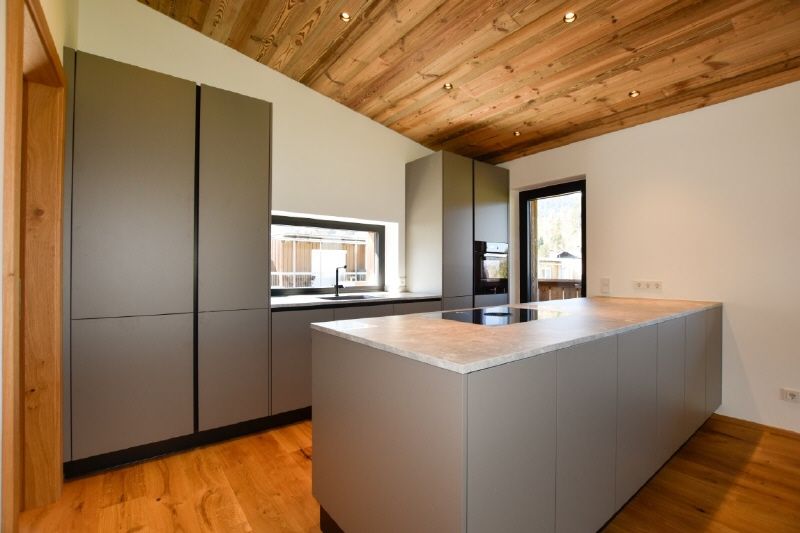 Kulinarik & Design: Die über geräumige Küche wurde von einem renommierten Kitzbüheler Tischler maßgefertigt und entspricht professionellen Ansprüchen.